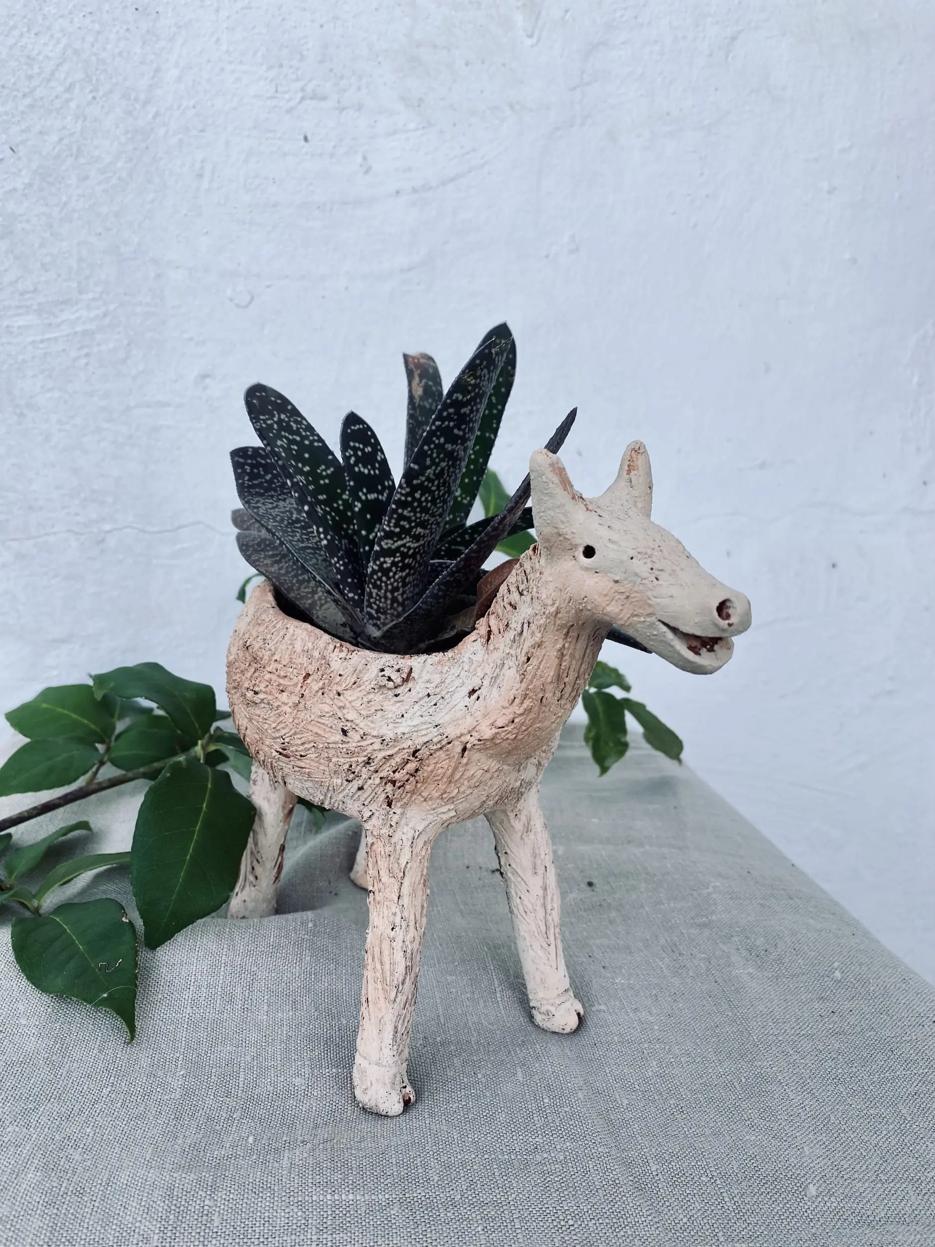 Natural clay donkey figure created with traditional Canarian technique in white light grey with salmon color touches. The piece is entirely created by hand by the Canarian artist Domingo Atalaya without the intervention of any machinery, following the ancestral techniques of the Canary Islands, specifically of Gran Canaria. The piece serves as a pot for plants and decorates your home both indoors and outdoors.