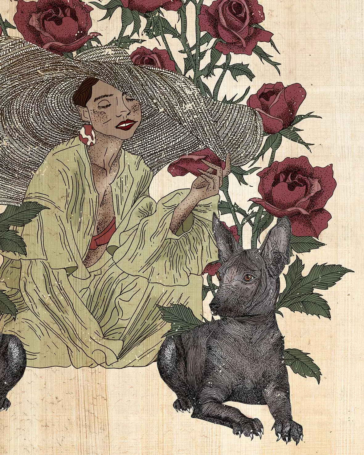 In Nahua cosmogony, Xólotl is a deity depicted as a dog, serving as the twin brother of Quetzalcóatl. While Quetzalcóatl presided over the sunrise, Xólotl accompanied him on the journey through the kingdom of Night and death. Frida Kahlo actively contributed to the preservation of the Xolo breed, which was nearly extinct during her time. Beyond keeping them as pets, the artist incorporated the Xolo as a symbol in some of her works, such as “El abrazo de Amor del Universo, y la Tierra (Mexico), Diego, yo, and Mr. Xolotl.”