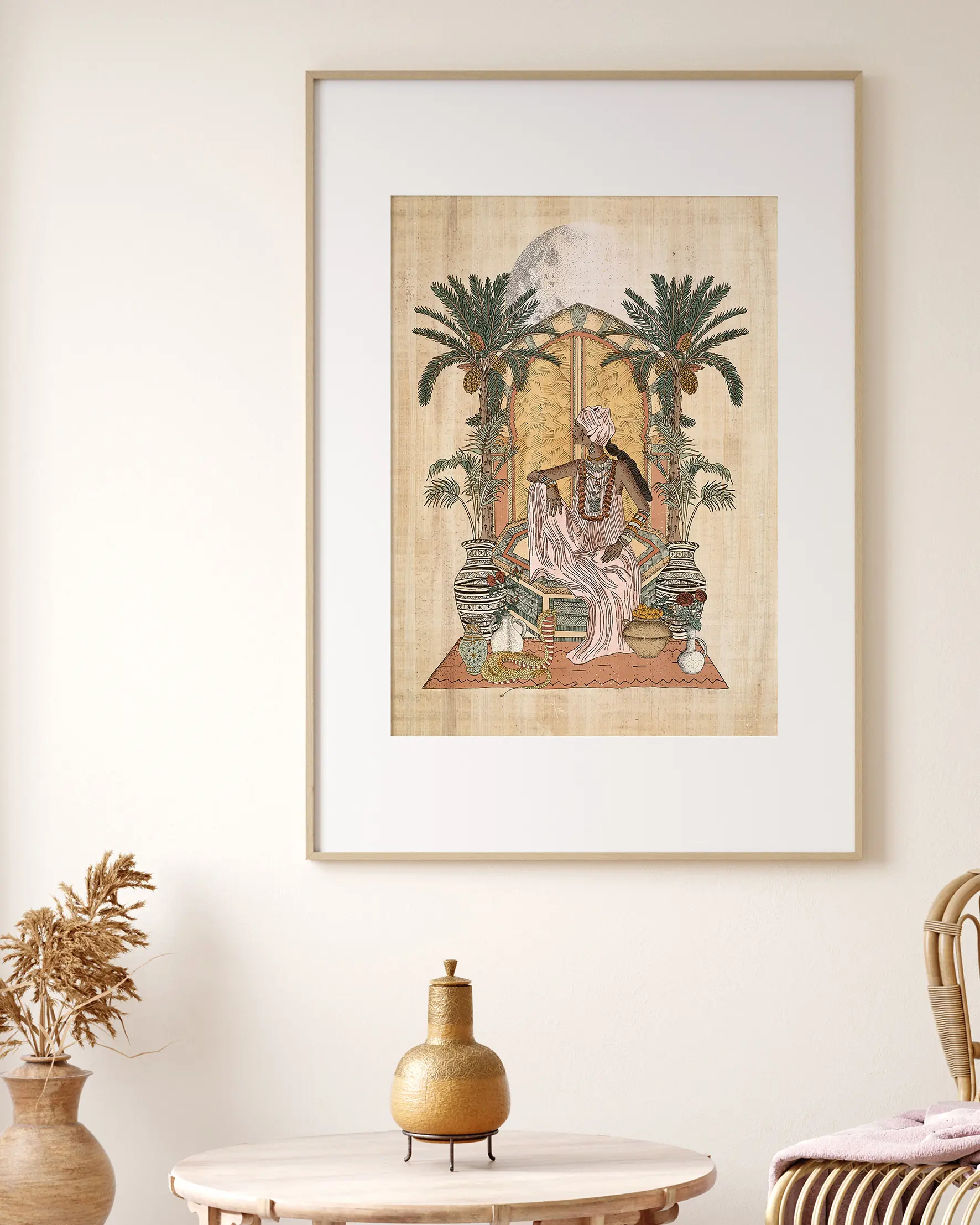 Bathed in desert pinks and earthy tones, she sits in quiet strength beneath a radiant full moon. Framed by symbolic palms and palace doors, this composition evokes the opulence of Marrakesh’s past while celebrating the women who continue to shape its living culture. A tribute to craftsmanship, color, and the sacred role of women in Moroccan heritage.